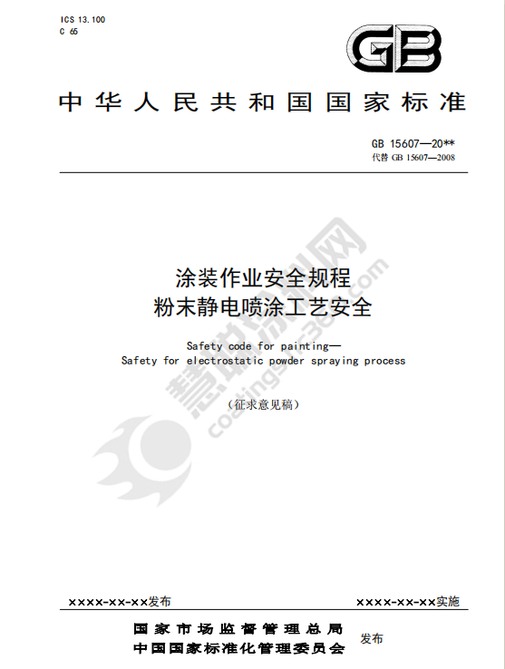 慧正资讯:1月13日,应急管理部安全生产基础司发布了强制性国家标准《涂装作业安全规程 粉末静电喷涂工艺安全(征求意见稿)》,向社会公开征求意见。此次公开征求意见时间为2020年1月13日至3月13日。