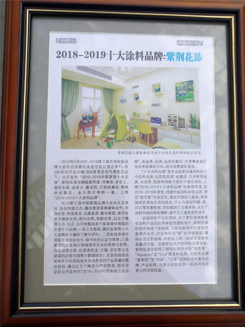 2019年6月,2019第三届中国家居品牌大会在北京新云南皇冠假日酒店举行,在200多名行业大咖、600多名企业代表的见证下,公开发布“2018-2019中国家居十大品牌”。大会上紫荆花漆被评为2018-2019十大涂料品牌,紫荆花已经连续三届获此殊荣。此评定是品质、品位的象征,代表着家居行业未来发展的方向,成为消费者的首选,在家居业具有很高的权威性和含金量。