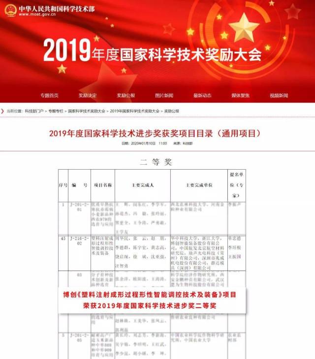 慧正资讯:1月10日,2019年度国家科学技术奖励大会在北京举行,共评选出296个项目和12名科技专家。其中,扎根于增城的企业博创智能装备股份有限公司(以下简称博创)与华中科技大学、浙江大学等合作伙伴共同承担的《塑料注射成形过程形性智能调控技术及装备》项目荣获2019年度国家科学技术进步奖二等奖。