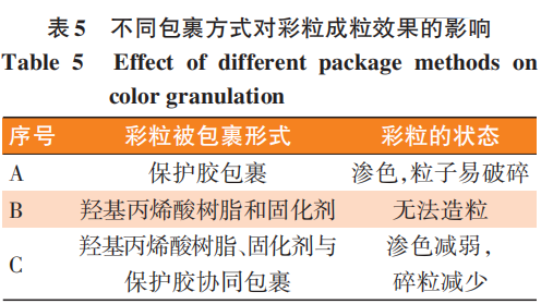 表5为不同包裹方式对彩粒成粒效果的影响,也反映了固化剂的添加与否对造粒产生的影响。