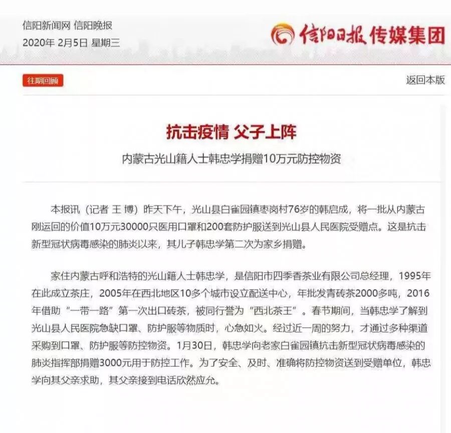 2月4日,洛阳理工92级校友、内蒙古校友会副会长韩忠学为故乡河南信阳市光山县捐赠10万元医疗防控物资。