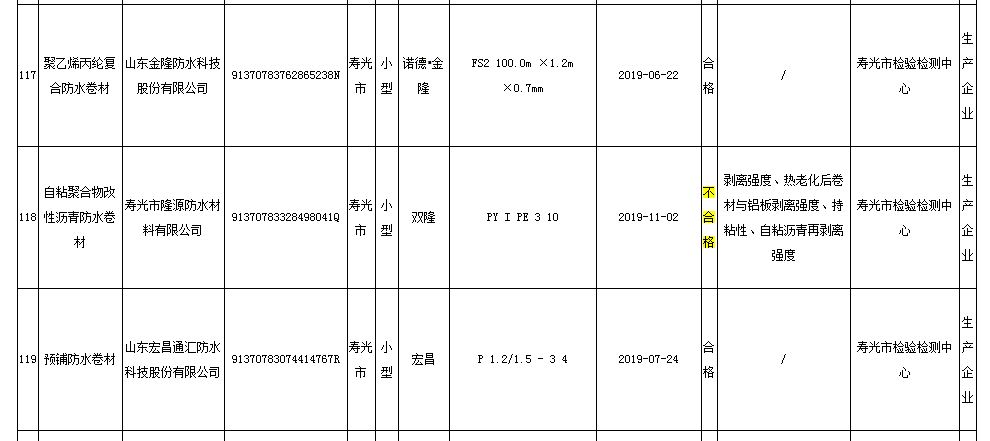 1、高分子片材产品。共抽查93家企业93批次产品,合格91批次,合格率97.85%,本次抽查主要对产品的拉伸强度(常温)、拉伸强度(高温)、拉断伸长率(常温)、拉断伸长率(低温)、撕裂强度、不透水性、低温弯折、加热伸缩量、热空气老化(拉伸强度保持率)、热空气老化(拉断伸长率保持率)、耐碱性(拉伸强度保持率)耐碱性(拉断伸长率保持率)复合强度(FS2型表层与芯层)等13项指标进行了检验。经抽查发现,2家企业2批次产品不合格,不合格项目:拉伸强度、撕裂强度、热空气老化(拉伸强度保持率、拉断伸长率保持率)。造成不合格的主要原因:加工过程中,企业为节约成本使用廉价原材料,质量把控不严格。