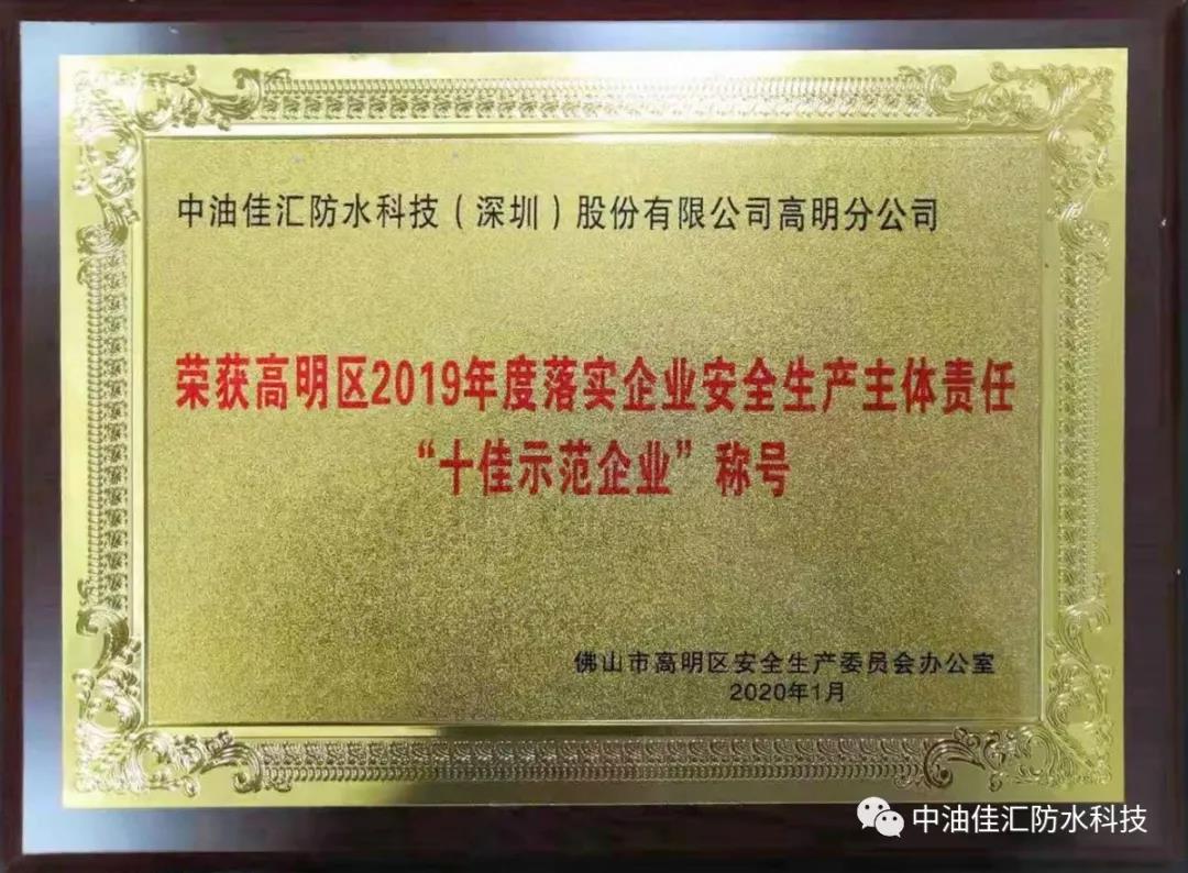 慧正资讯:近日,佛山市高明区安全生产委员会办公室授予中油佳汇高明分公司(佛山工厂)“高明区2019年度落实安全生产主体责任十佳示范企业”称号,并予以颁发牌匾,标志着中油佳汇佛山工厂安全生产管理水平得到了安全监管部门的认可,安全生产管理工作再上新台阶。
