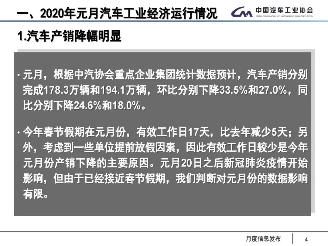 慧正资讯:2020年2月13日下午,因疫情影响,每月一次的中国汽车工业协会信息发布会改为线上发布。本次信息发布会主要发布了:2020年元月汽车工业经济运行情况、新冠肺炎疫情对行业影响、下一阶段产业发展形势初步研判、近期中汽协会开展的工作。中国汽车工业协会副秘书长师建华出席发布会,中国汽车工业协会副总工程师许海东主持发布会,中国汽车工业协会副秘书长陈士华介绍了2020年1月汽车工业经济运行情况。来自新华社、中央电视台等100多家媒体的记者参加了本次发布会。