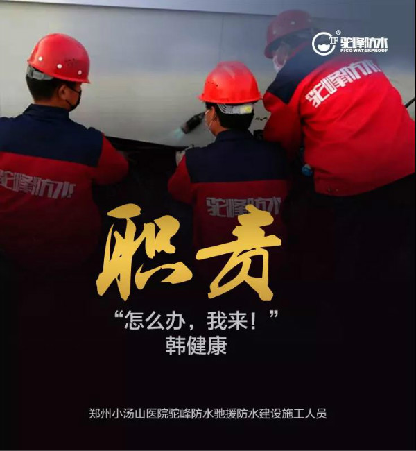 2020年2月4日,驼峰防水迅速成立“郑州小汤山”医院捐赠专项小组。2月4日晚上8:00,首批30吨防水物资火速抵达郑州小汤山医院。2月9日晚上6:00,驼峰防水再次收到中建七局补充防水材料的“紧急通知”。2月9日晚上12:00,第二批防水物资迅驼峰用最短时间将所需材料运输到现场,交于驼峰防水施工团队后,在确保施工质量的前提下,再次完成任务,打赢疫情反击战。