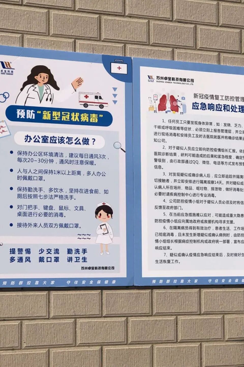 卓宝积极启动疫情防控机制,明确各项防控细则,并制定防控期间办公、生产、运营管理的具体要求,以确保卓宝员工及其家人的身体健康与生命安全。全员进行防疫宣传教育,并通过张贴海报、网络课程等形式向员工普及防疫相关知识。