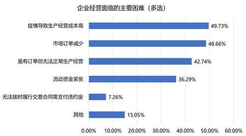 调研数据显示,生产成本高和市场订单减少仍是目前材料企业面临的主要困难,受上下游产业链及运输管制影响,有42.74%的企业即使获得了订单,也无法正常生产经营。