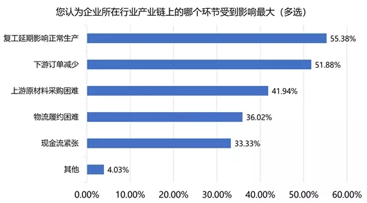 调研数据显示,从产业链来看,本行业正常生产、下游客户需求、原材料供给及物流履约等环节均受到了比较大的影响。其中,超过一半的企业认为复工延期影响正常生产以及下游订单减少影响最大。