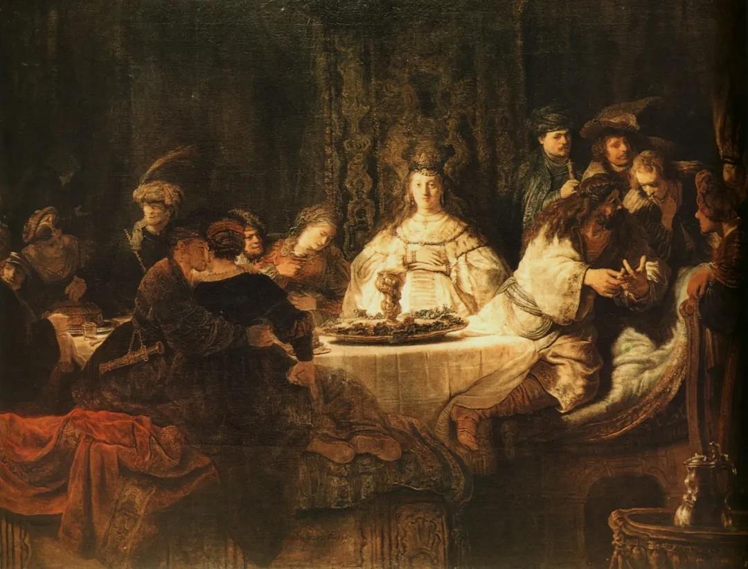 相较于鲁本斯的细致奢华,伦勃朗的画作则显得更为粗放,他戏剧性的光影运用,带给观众的是一种无形的张力和永恒的生命力;《参孙在婚宴上出谜》这幅画作是他对于一种更生动的群像构图方式探索中交出的一份属于自己的答卷,用不同饱和度的红色明暗交织,恰到好处地光影呈现成就了独特的个人风格,也成就了艺术上最伟大的伦勃朗。