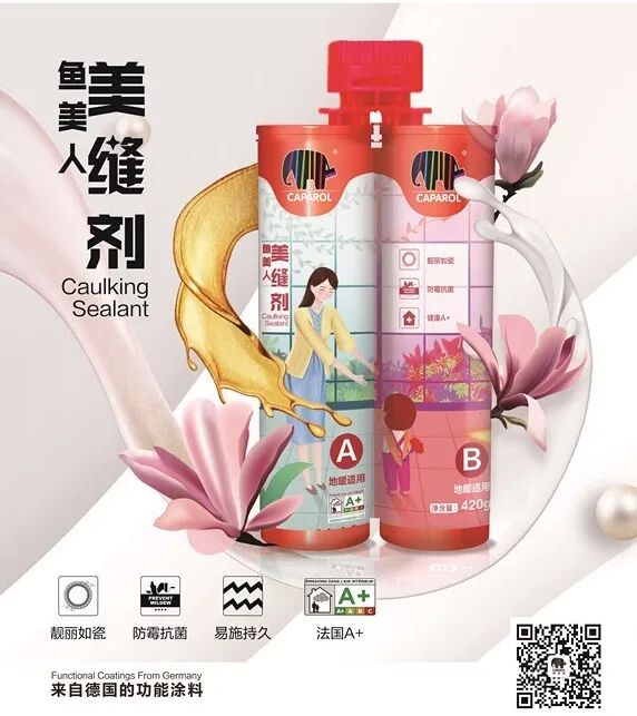 美人鱼美缝剂是采用优质高分子环氧树脂,专用固化剂及优质颜料等材料组成的双组份美缝材料,具有靓丽如瓷、防霉抗菌、柔韧耐候、耐污易洁、法国健康A+认证、易施持久等优势。