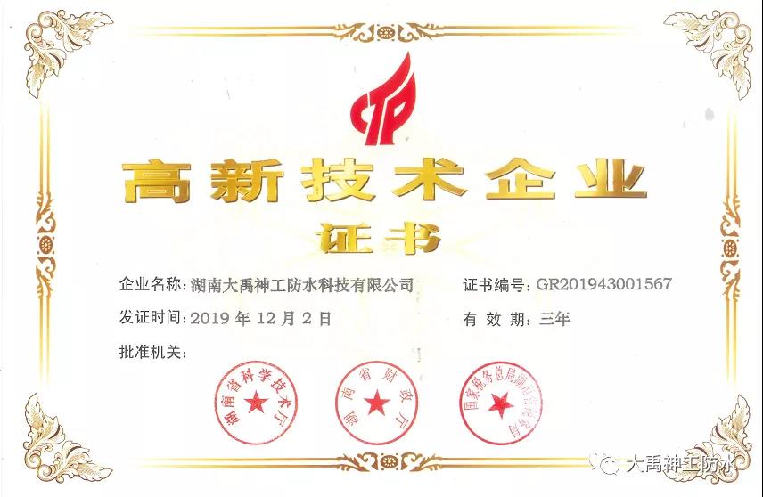 慧正资讯:热烈祝贺大禹神工防水集团旗下湖南大禹神工防水科技有限公司获得国家高新技术企业认证。