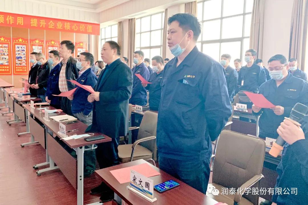 与会人员以饱满的热情和激昂的斗志共同演唱《润泰之歌》。泰兴公司总经理、试车领导组总指挥王继云发表试车动员报告,首先明确阐述主装置的开车节点目标、试车责任和保证措施。其次,王总对项目的过程进行了总结,并对高效能团队提出目标管理、有效协同、群策群力的要求。自2019年8月至今,润泰化学泰兴公司年产4万吨(异/正)丁酸建设项目暨年产5万吨十二碳醇酯技术改造项目通过全体参建人员的共同努力,特别是在疫情抗争的大背景下如期进入了试车关键阶段,越是艰险越要向前!最后,他号召大家要统一认识,安全第一、强化责任、众志成城、勇于拼搏,以更加饱满的精神状态,全力以赴,圆满完成主装置开车任务。