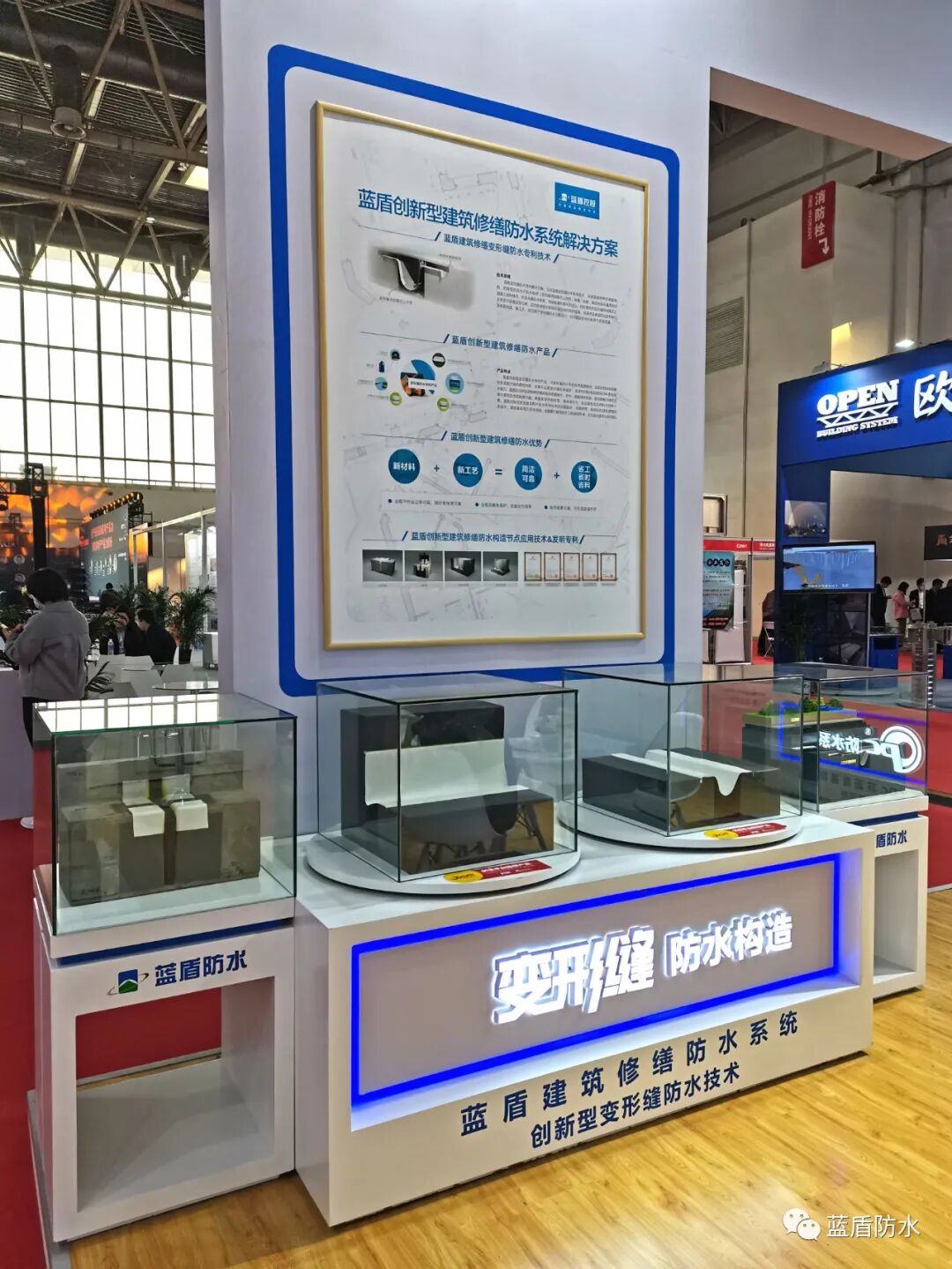 展厅以模型展示+现场介绍的形式,向观展者展示了蓝盾创新型变形缝防水技术的原理和使用场景,相关模型被众人围观。