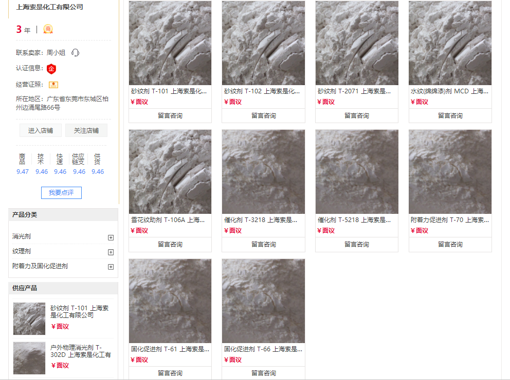 自2003年成立以来,索是化工不断创新发展,为客户提供优质产品,尤其是粉末涂料助剂领域。目前,索是化工生产、经营的“T系列”产品有消光剂、各种纹理剂及功能型添加剂,在户内、户外消光剂方面,可为客户提供完整的、科学的消光材料组合体系;与此同时,索是化工还可以为客户定点开发特殊的助剂品种,提供全方位、高质量的技术服务。