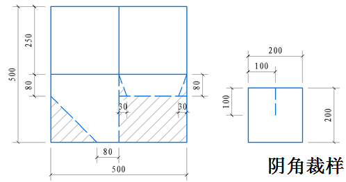 a. 阴阳角(三面角):按照下图进行阴阳角裁样,边撕开卷材下表面隔离膜边铺贴卷材,并用压辊压实。