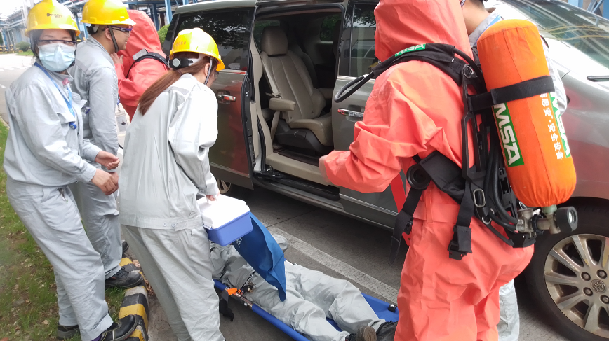 应急抢险组迅速穿戴完备,携带救援装备,火速赶往事故现场。事故处理过程中,应急抢险组人员立即关闭泄漏阀门,并将中毒人员抬上担架,转移至通风空旷处,其余人员进行现场泄漏处置。