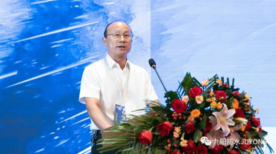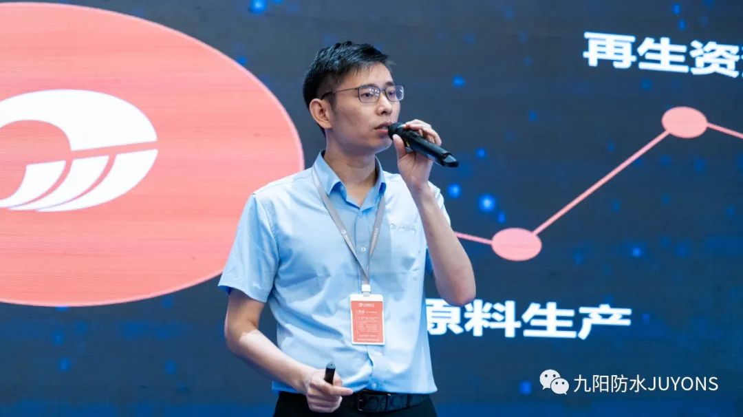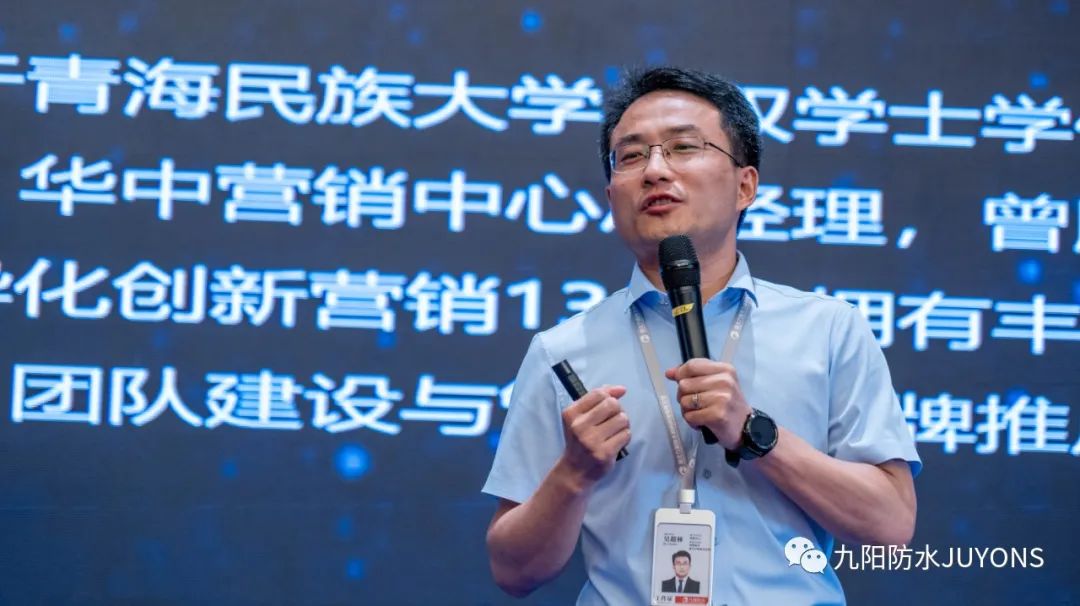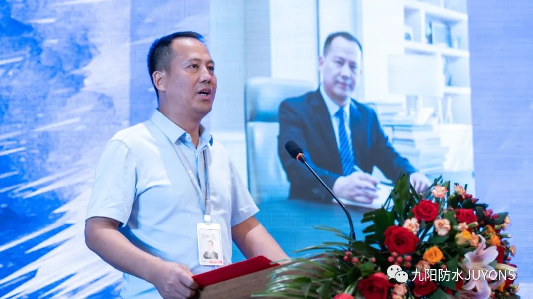 随着致辞环节的结束,九阳防水销售副总经理金坤介绍了公司的发展历程及战略规划,指出九阳防水自创立以来,一直在防水行业深耕厚植,现已发展成为集原材料供应、研发、生产、销售和施工服务为一体的专业化防水生态企业,目前拥有5大生产型制造基地,9大驻外服务中心,20多个驻外办事处和上百家经销代理服务网点,拥有省内最大的施工实训基地,高分子重点实验室,40000吨沥青储备能力,9800万平米的产供能力,国内先进环保设备,以及超500人的销售、技术、商务精英,近100件的专利技术,超100项的荣誉资质认证等软硬实力的支撑。