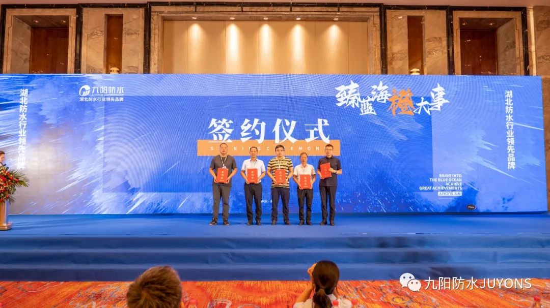 会议期间还举行了现场签约仪式,安徽合肥力韦防水装饰工程有限公司、河南尚润建设有限公司、河南洛阳文橙商贸有限公司、湖北新方居商贸有限公司等与九阳防水现场签署了战略合作协议。