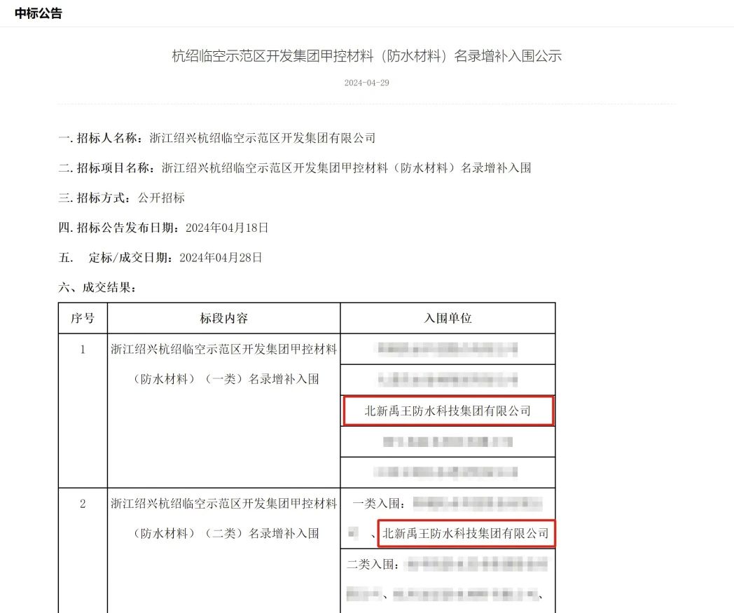 慧正资讯:近日,杭绍临空示范区开发集团(区轨道交通集团)甲控材料(防水材料)名录入围招标结果完成公示,北新防水凭借过硬的产品质量、精湛的技术方案以及完善的系统服务,以A类品牌成功入围。