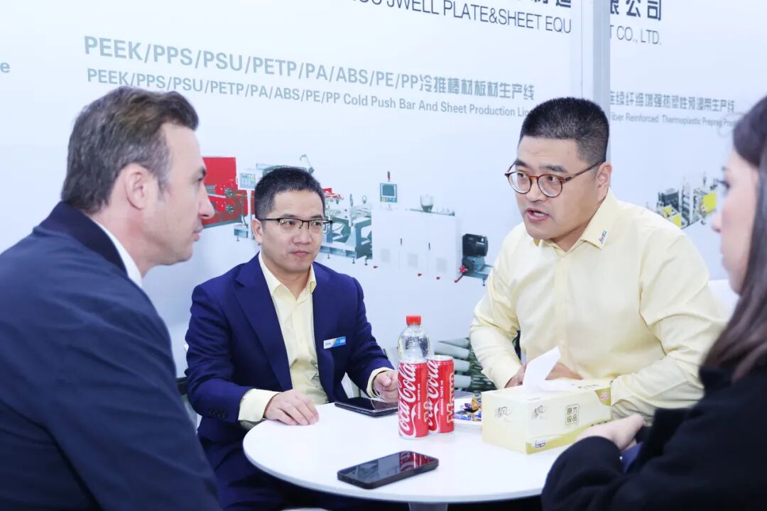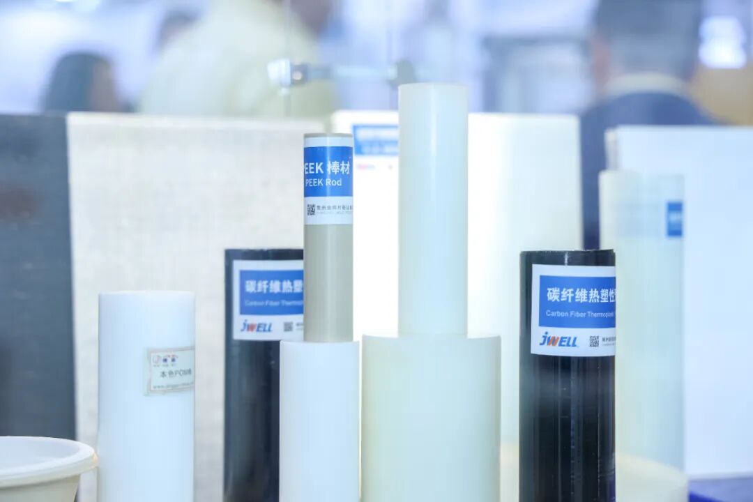 慧正资讯,在2025年德国K展上,金纬机械展示了一款专为特种工程塑料设计的冷推生产线,吸引了众多专业观众的目光。该生产线适用于PEEK、PPS、PEKK、PI等特种工程塑料,能够生产板材、棒材、管材等高附加值产品,展现了其在高效节能、高度自动化和智能互联方面的核心优势。