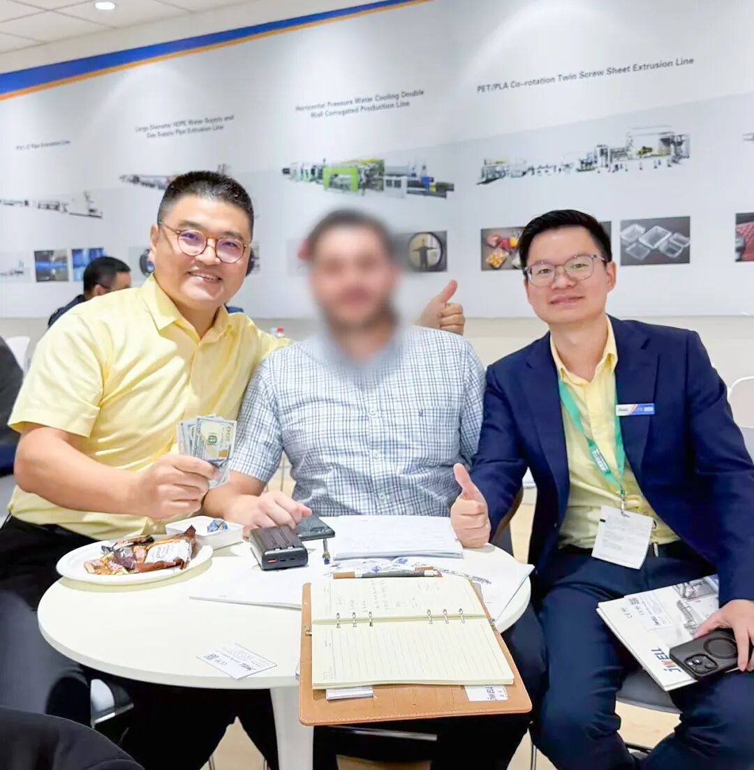 展会前三天,苏州金纬的销售团队已经现场成交超过150万美元并收到订金,这一成绩不仅体现了客户对金纬的高度信任,也彰显了金纬在行业内的强大影响力和品牌实力。来自北非的客户下单了片材挤出设备,南美客户下单了板材挤出设备,西亚客户下单了防水卷材生产线,中东客户下单了管材挤出设备,订单源源不断,充分展现了苏州金纬产品的全球吸引力。