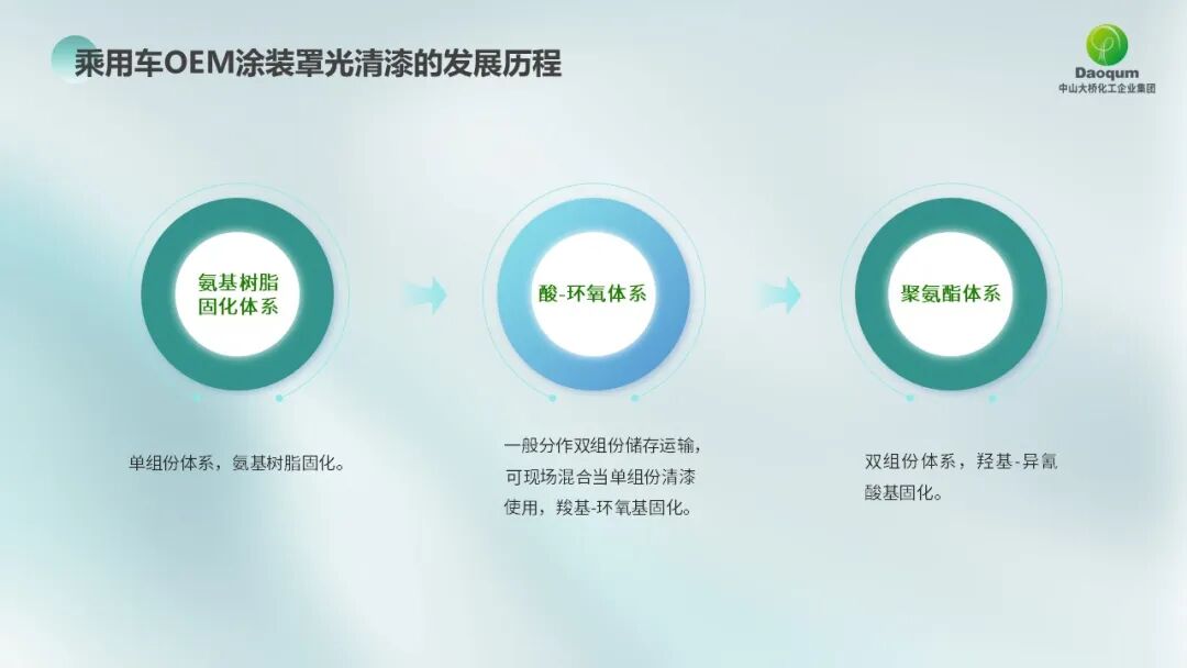 乘用车OEM涂装罩光清漆已随着汽车工业的发展,由传统的氨基固化单组份体系替换为各方面性能更好的聚氨酯双组份体系,并不断发展。中山大桥化工集团紧跟时代步伐,自主创新开发了聚氨酯双组份清漆(以及配套使用的电泳漆和水性中涂、色漆等产品)后,继续努力对其更新迭代,以满足更多的乘用车主机厂对于原厂涂装罩光清漆的需求。