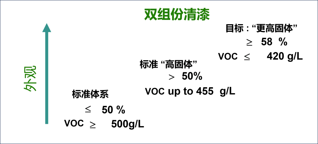 相比单组份丙烯酸氨基型高固体份清漆50%左右的施工固含,2K聚氨酯清漆的施工固含不低于58%,是满足T/CNCIA 01001-2016标准的真正严格意义上的高固体分清漆;其施工VOC能达到420g/L以下,属于GB/T 38597-2020中要求的低挥发性有机化合物含量涂料产品。