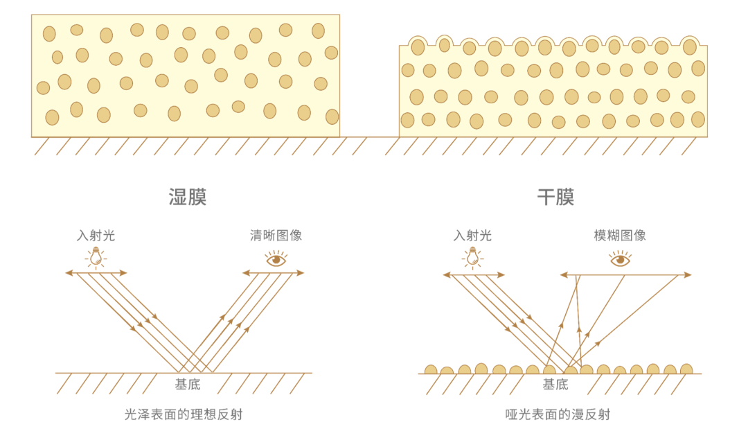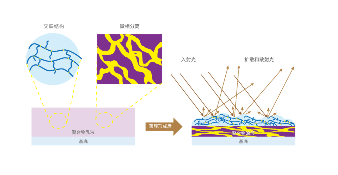 通过控制树脂结构的Tg、极性等 ,人为制造出一定的差异,使漆膜结构呈现一种微相分离的效果,来实现消光效果。
