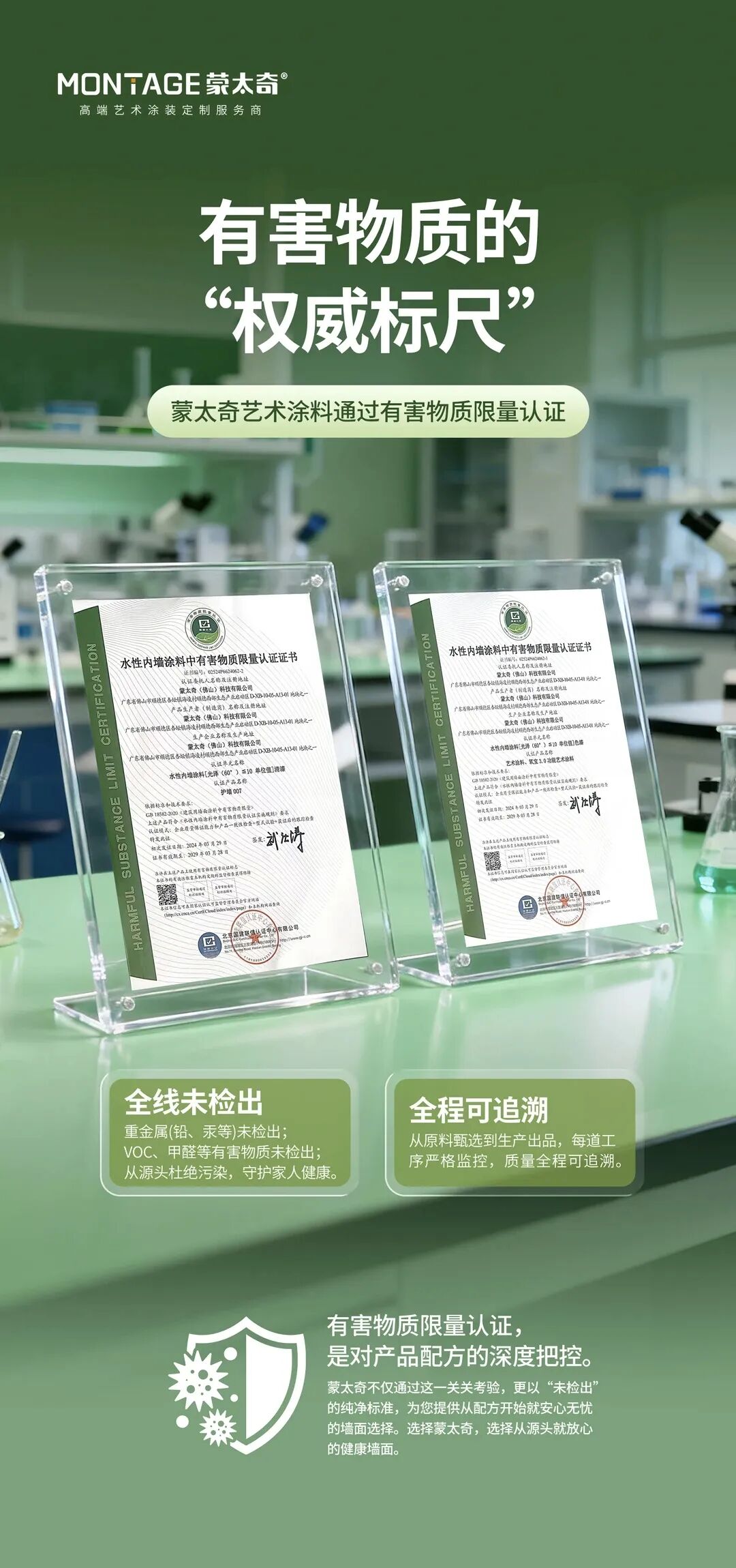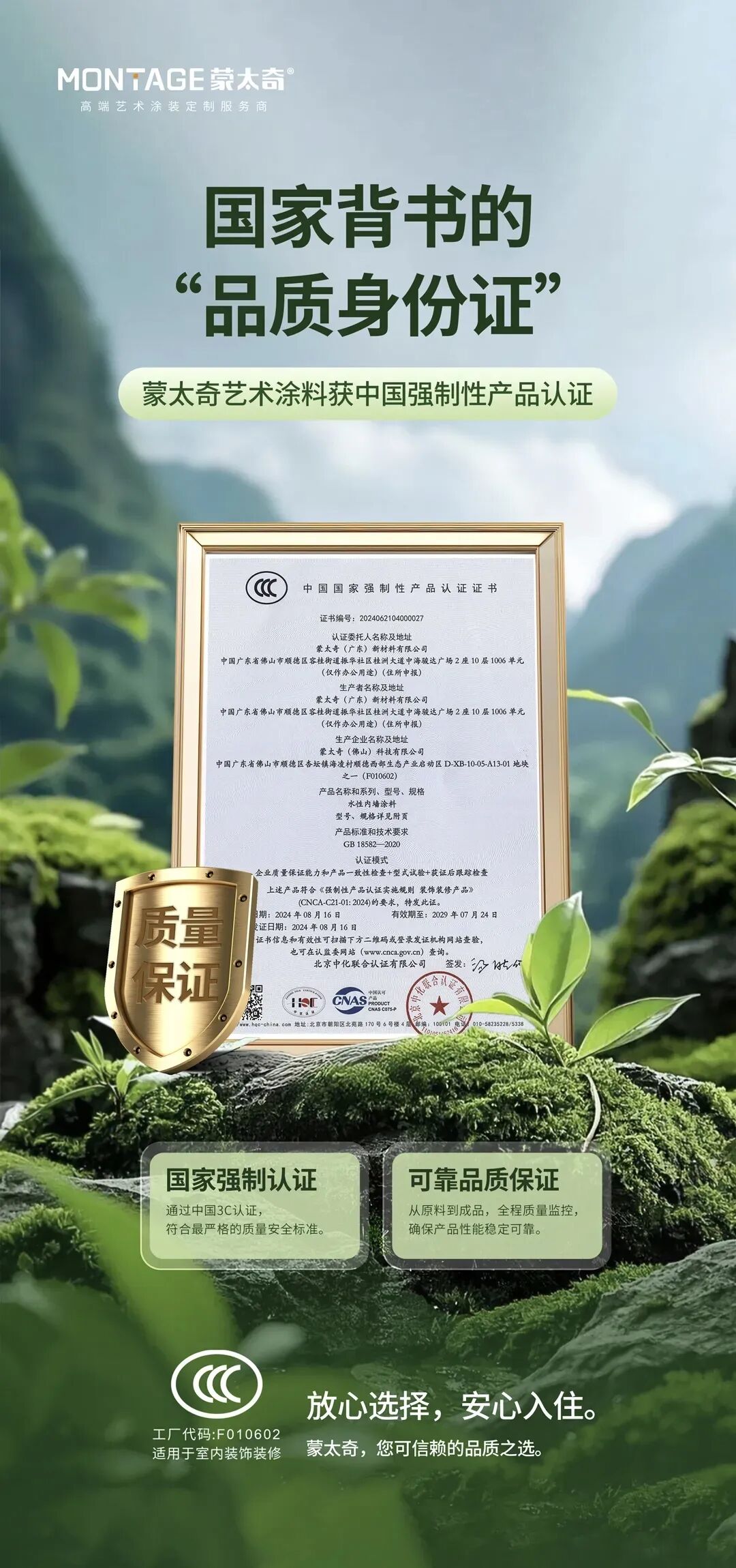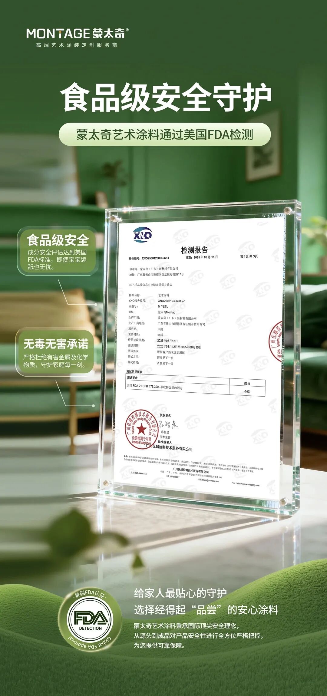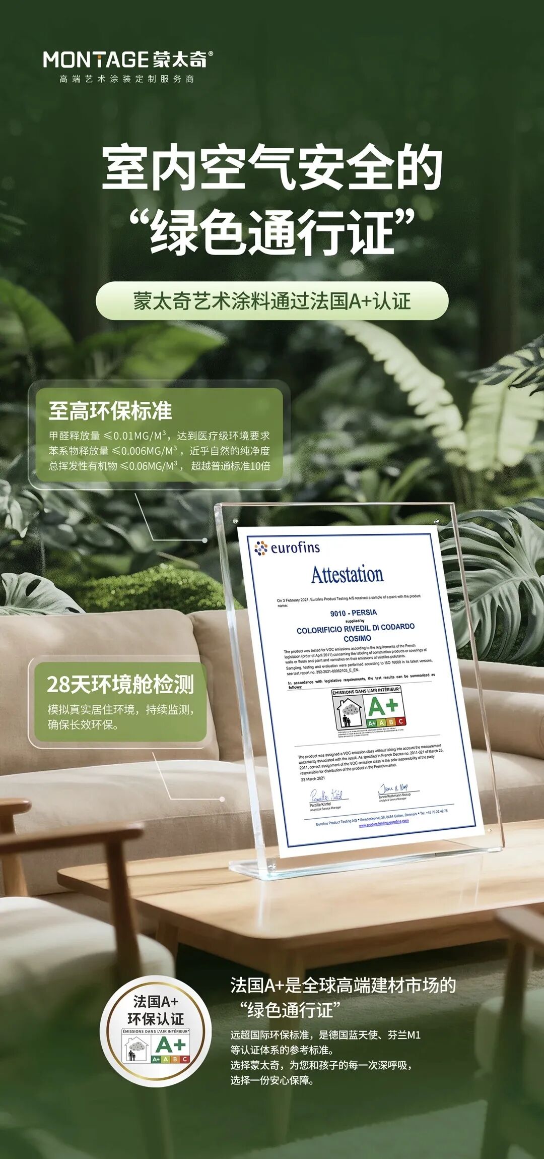 蒙太奇艺术涂料始终坚持“自然主义美学”,将艺术表达与环保功能深度融合,致力于让家成为会呼吸的艺术空间。产品所具备的森林级空气品质,依托负氧离子技术,让居家环境焕发自然升级;全线产品均通过法国A+、美国FDA等国际权威环保认证,真正实现即刷即住,为消费者带来安心的居住体验。