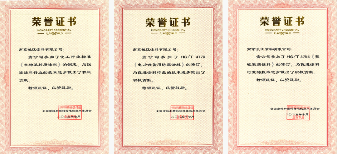 作为涂料行业的深耕者与引领者,长江涂料始终将标准化建设置于企业发展的战略高度。公司凭借深厚的技术积淀和行业洞察力,多年来持续深度参与国家、行业及团体标准的起草与修订工作。公司2025年新参与制、修订了《生物基树脂涂料》《电力设备用防腐涂料》以及《聚硅氧烷涂料》等标准,累计主导或参与制定《钢结构用水性防腐涂料 》《 水性醇酸树脂涂料》《带锈涂装用水性底漆》等各类标准30余项。