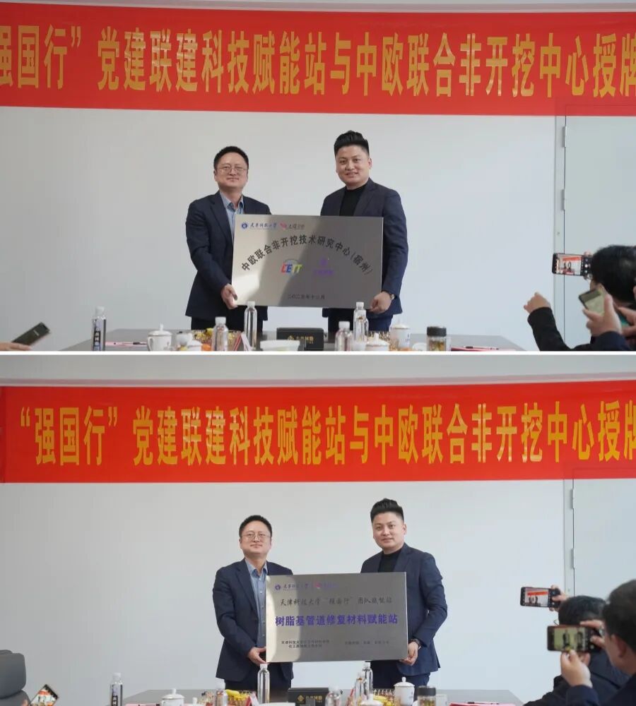 仪式的核心环节,气氛推向高潮。曹井国教授代表天津科技大学,路旭东总裁代表方鑫树脂,共同签订产学研合作协议,标志着双方在科技创新、人才培养等方面的合作迈入新阶段。随后,曹井国教授为路旭东总裁依次授予 “党建联建科技赋能站”“中欧联合非开挖中心” 牌匾,两块沉甸甸的牌匾,既是荣誉更是责任,象征着方鑫树脂在党建引领、科技赋能的道路上迈出了坚实一步,为企业产学研融合、技术创新升级搭建了更广阔的平台。