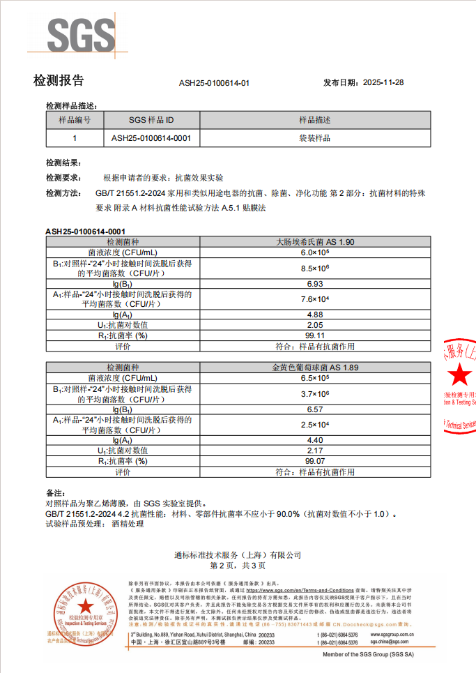 经专业检测机构检测,依据《GB/T21551.2-2024家用和类似用途电器的抗菌、除菌、净化功能》标准检测,对大肠杆菌、金黄色葡萄球菌的抗菌率高于99.99%