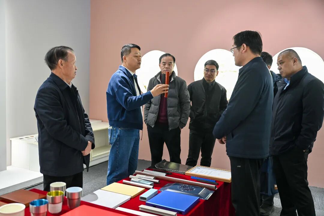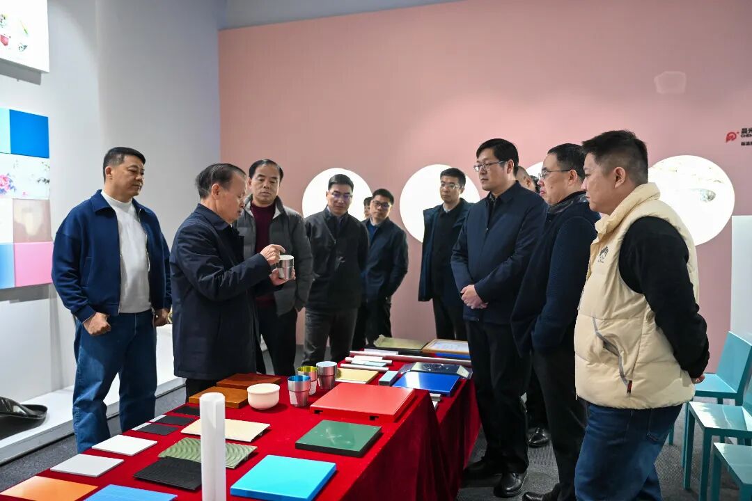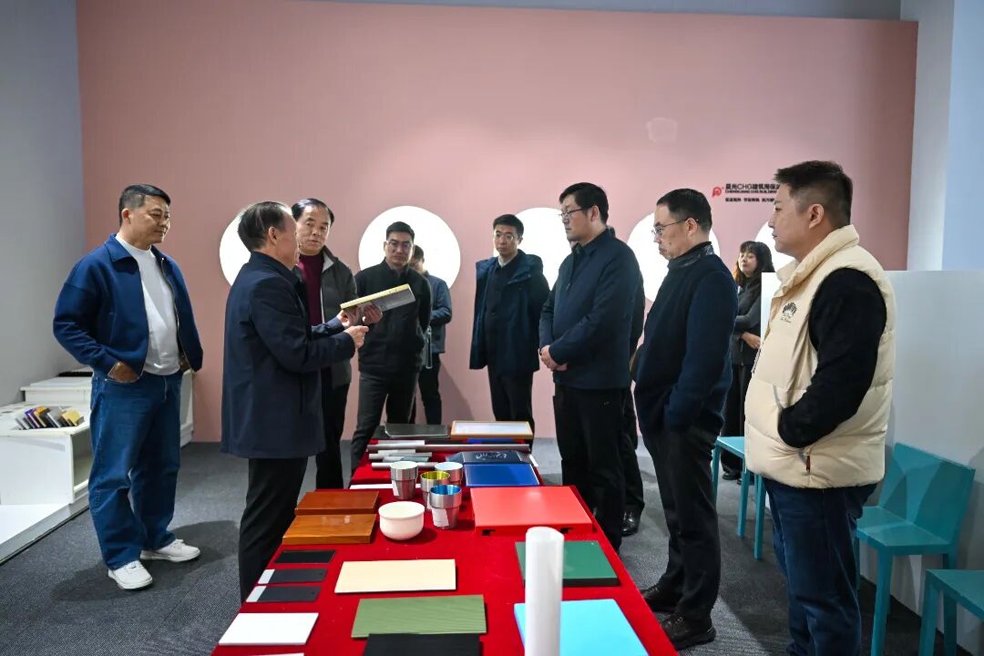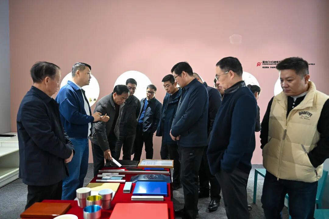考察团一行首先参观了晨光智慧馆。在展厅内,缪董亲自担任讲解,详细介绍了晨光涂料三十六载的发展历程与企业文化。当一行人驻足于智能变色调光玻璃和陶瓷水漆等核心产品展区前时,高校领导们表现出了浓厚的兴趣。
