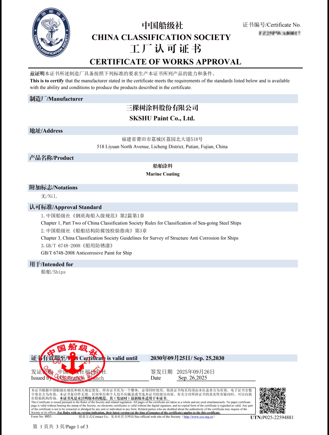 获由中国船级社(CCS)颁发《工厂认可证书》,标志三棵树具备为全球各类船舶及海洋装备提供国际水准防护服务的核心资质。