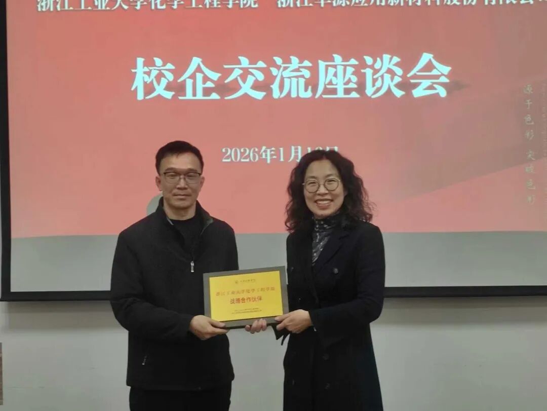 浙江工业大学化学工程学院向华源新材授予“战略合作伙伴”牌匾。此次授牌象征着双方在原有良好合作基础上实现深度升级,标志着校企合作平台正式迈入提质增效的新阶段。