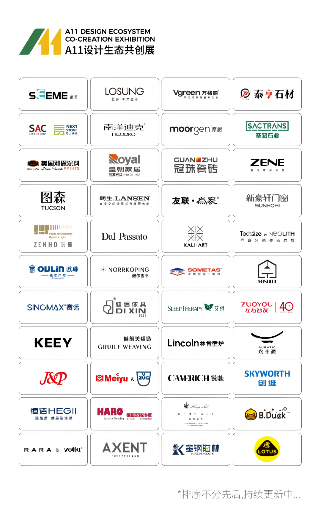 本届A11设计生态共创展已吸引包括RARA、美国邓恩涂料、锐驰、恒洁、图森等上百家中国家居领域代表性品牌加入共创联盟。参展设计师将与品牌方展开深度合作,通过将前沿的策展设计与顶尖制造能力相结合,共同呈现体现中国当代审美与制造水平的完整场景解决方案。