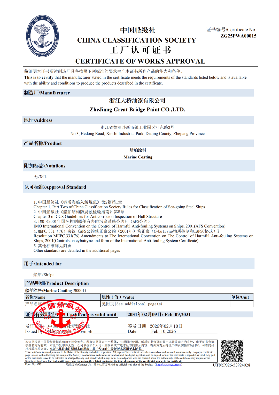 慧正资讯,近日,浙江大桥油漆有限公司(以下简称北新大桥)获中国船级社(CCS)颁发的《工厂认可证书》,这标志着北新大桥船舶涂料已全面符合 IMO 及中国造船规范严苛要求,具备为各类船舶、海洋平台及海洋工程装备提供国际水准涂层防护的核心资质,成为央企助力海洋经济高质量发展的重要实践,为全球船舶工业打造更安全、环保、长效的海洋腐蚀防护解决方案。