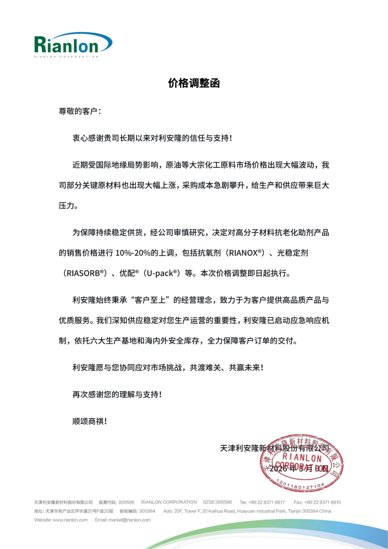 利安隆抗氧化剂、光稳定剂产品调价函
