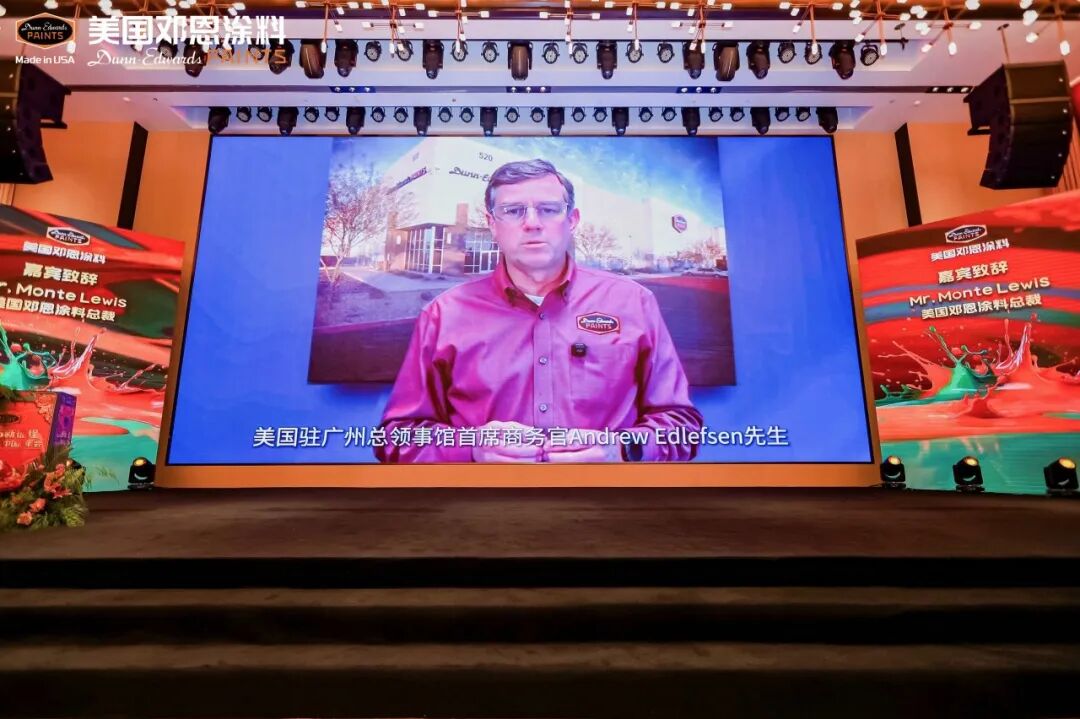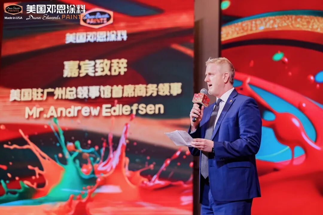 美国驻广州总领事馆艾安首席商务领事致辞,美国邓恩涂料海外销售总经理David Henry代表美国总部致贺词。