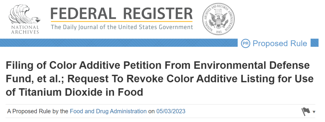 慧正资讯,5月3日,美国食品药品监督管理局(FDA)公布了一项由环境保护基金(EDF),环境卫生中心(CEH),食品安全中心(CFS),公共利益科学中心(CSPI)和环境工作组(EWG)提交的请愿书,提议废除允许在食品中使用二氧化钛(钛白粉)作为颜色添加剂的条款—— 21 CFR 73.575。