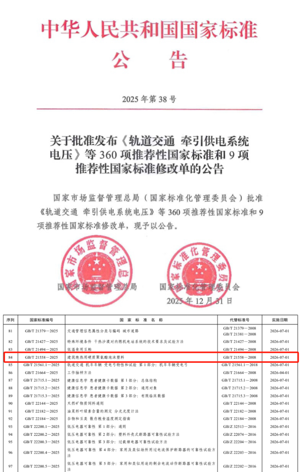 作为建筑保温材料领域的重要标准,GB/T 21558《建筑绝热用硬质聚氨酯泡沫塑料》近期完成了重要修订,并于2025年12月31日正式获批发布,将于2026年7月1日起实施。该标准修订计划于2025年4月30日正式下达,以万华化学集团、北京工商大学等单位牵头的标准修订工作组在全国塑料制品标准化技术委员会(TC48)的指导下,高效协同、精益求精,高效率、高质量地完成了标准的修订任务。新版标准在2008版基础上进行了全面升级,更加适应当前建筑节能与消防安全要求,为行业发展提供了重要技术支撑。本文将对比新旧版本变化,深入解读新版标准的核心内容。